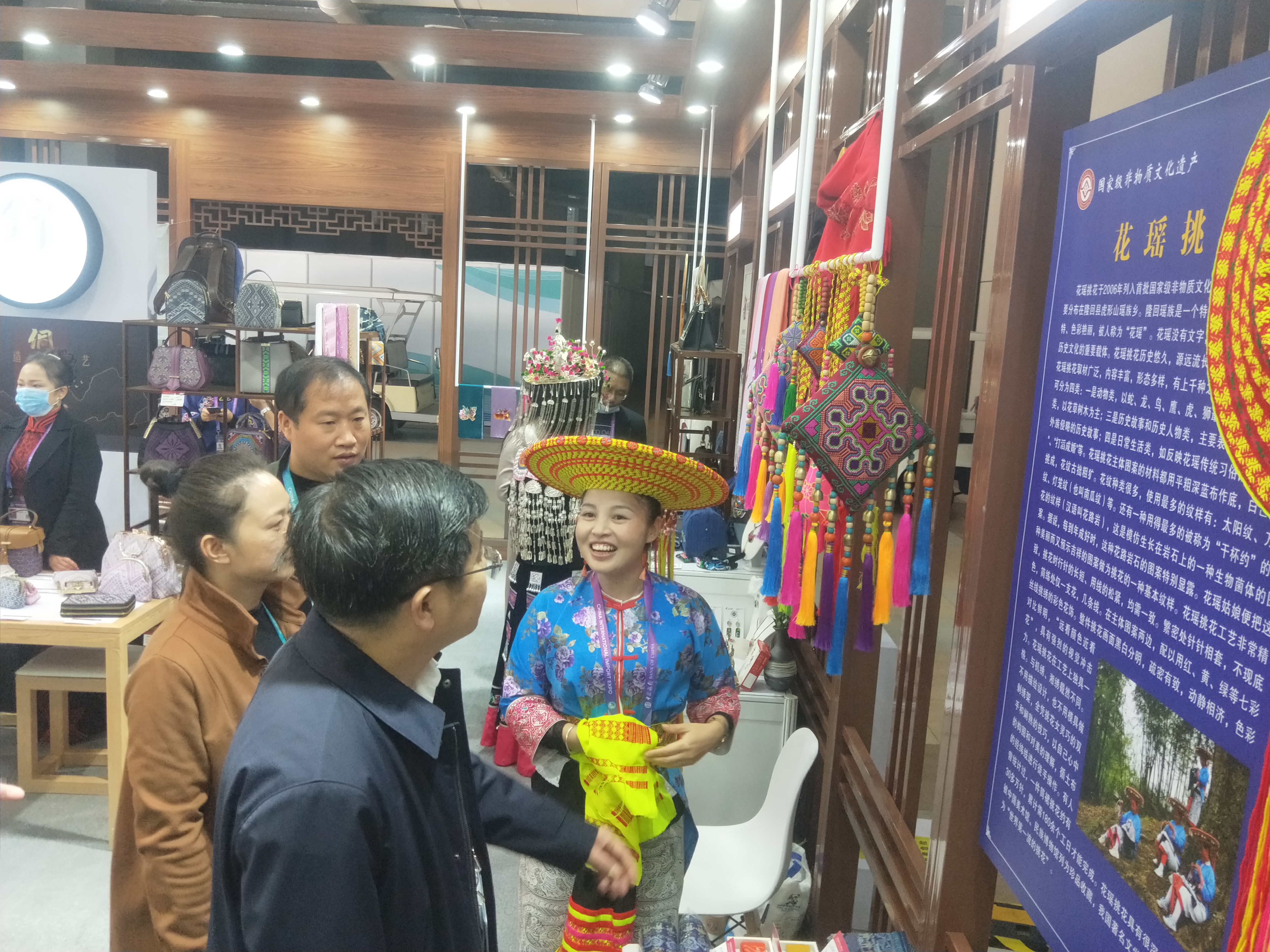 4幅精选的花瑶挑花服饰及挑花手机壳、挑花雨伞、挑花手机带、挑花袜子等10个挑花文创产品共50余件花瑶作品在此次会会展中心展示。花瑶挑花造型独特,色彩艳丽,图案古朴繁杂,无固定模具,全凭一双慧眼和一双巧手,看到什么绣什么,绣什么像什么,展示了神秘花瑶古老的民俗风情,吸引了众多游客和参展商的驻足观赏,让观众们大叹神奇,不吝称赞。