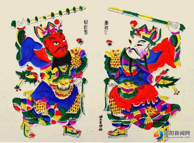 除了花瑶“非遗”文旅精品之外,作为汉族特有民间工艺品的滩头年画也是来隆各族游客喜闻乐见的文旅产品。滩头年画历史悠久,艺术价值极高,2003年,滩头年画在北京获得中国传统工艺品金奖,2006年6月,滩头年画被列为首批国家级非物质文化遗产项目。滩头年画多以祝福新年的喜庆丰登,免除灾祸的古老民间习俗为题材,反映人们对生活的美好祝愿和精神寄托,因此受到各族人民群众的普遍喜爱。在不断的传播与演变中,滩头年画业融合了许多少数民族的文化内涵,《苗族英雄》便是滩头独有保留题材,苗族英雄头顶披风,一手持梅枝、如意,一手执鞭、锏,由传统的秦叔宝、尉迟恭,演变成苗族群众心目中崇拜的偶像,深受湘黔苗族聚居地群众喜爱。