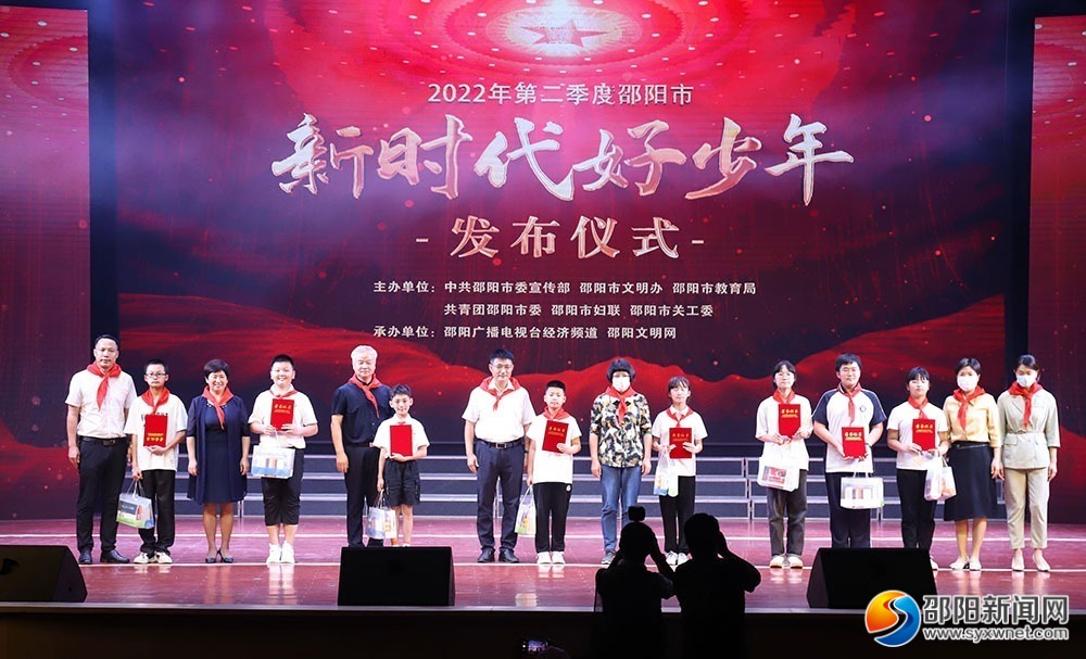 活动现场还举办了邵阳市2022年第二季度“新时代好少年”颁奖仪式,刘宸伯、谢孟轩、黄锦颢、申喆方、罗浩钰、黄子诚、曾雅馨、李雨馨等14名同学被授予邵阳市2022年第二季度“新时代好少年”荣誉称号。