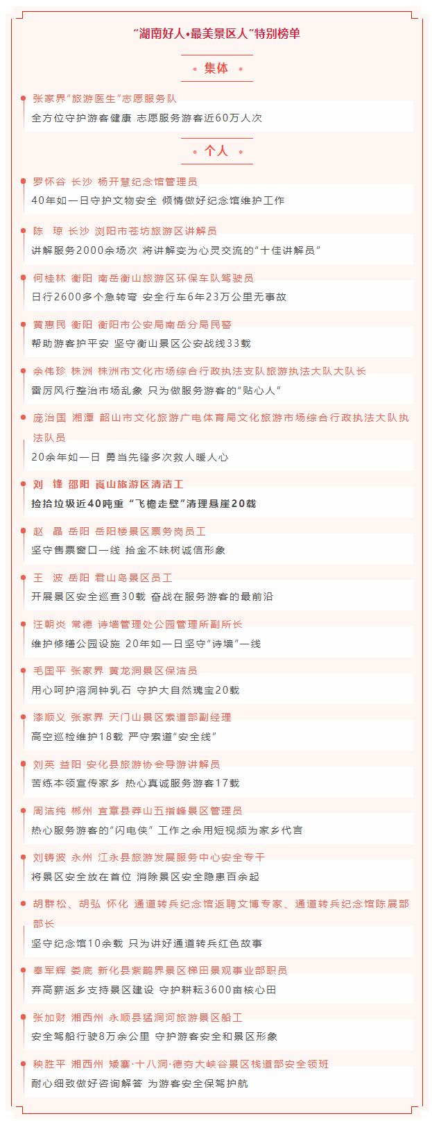 为进一步提升湖南旅游的品牌美誉度,增强湖南景区的文明吸引力,9月6日,湖南省文明办、湖南省文化和旅游厅联合发布“湖南好人·最美景区人”特别榜单,授予张家界“旅游医生”志愿服务队、邵阳刘峰等20人(组)为“湖南好人·最美景区人”称号。