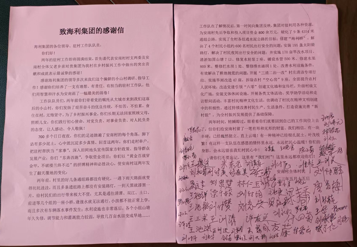 邵阳新闻网5月19日讯(通讯员 刘飞燕 谭春涛)“感谢海利集团的领导多次来我们这个偏僻的小山村调研、指导工作!感谢你们培养了一支有理想、有责任、有担当的驻村工作队,他们用智慧和汗水为安南画了一幅最美的画卷!”5月16日,洞口县竹市镇安南村乡村振兴驻村帮扶后盾单位湖南海利集团收到了一封来自安南村全体村民的感谢信。