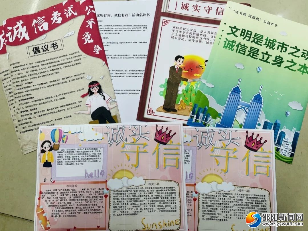 该校志愿者们提前搜集了许多有关诚信的小故事和诚信格言并制作成诚信教育宣传单,为学生、家长以及校园周边的商户们发放了“文明有你,诚信有我”活动倡议书,并将诚信教育扩展到学生家庭中,倡议每位家长要树立好个人诚信形象,为孩子营造一个诚信教育的良好氛围。