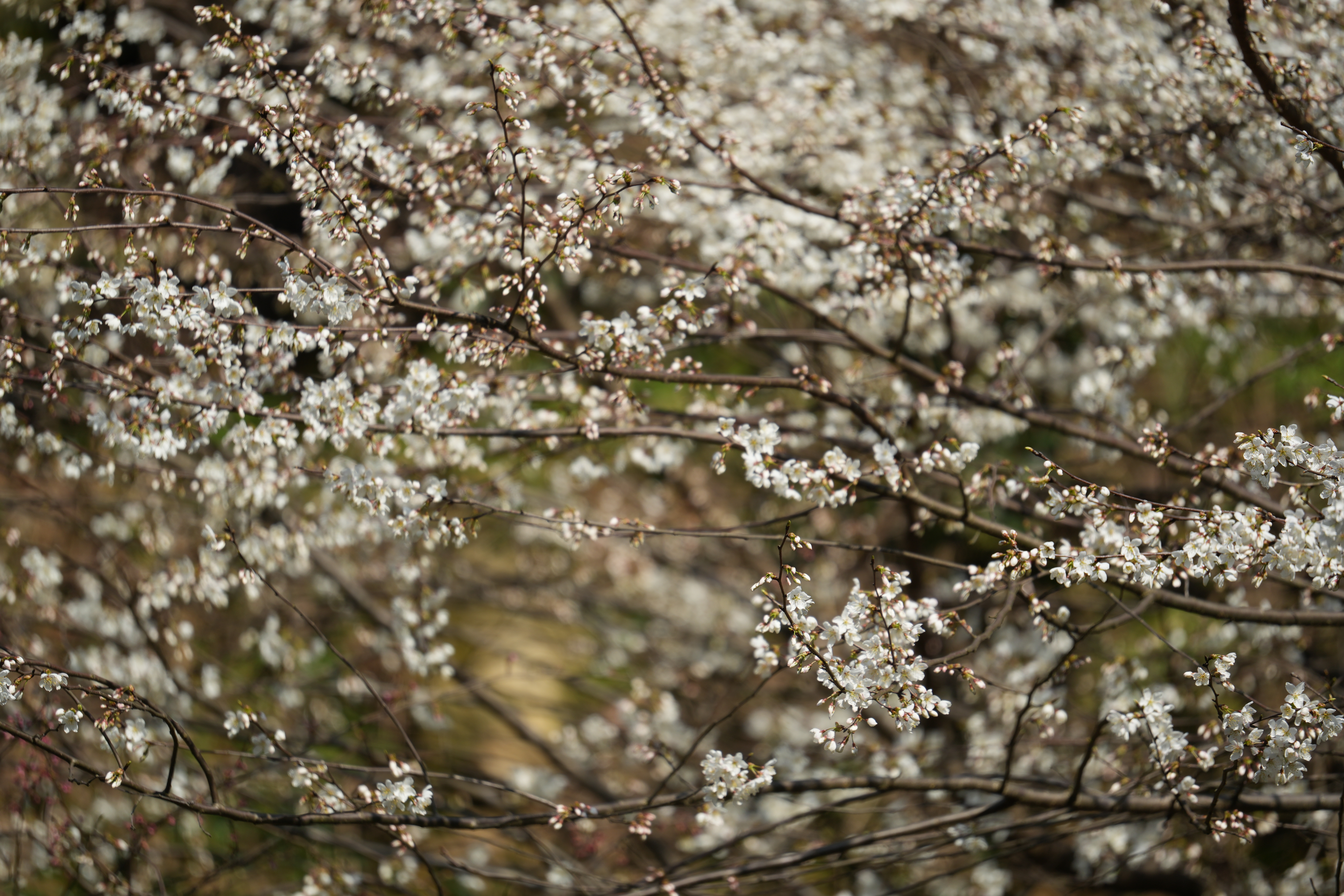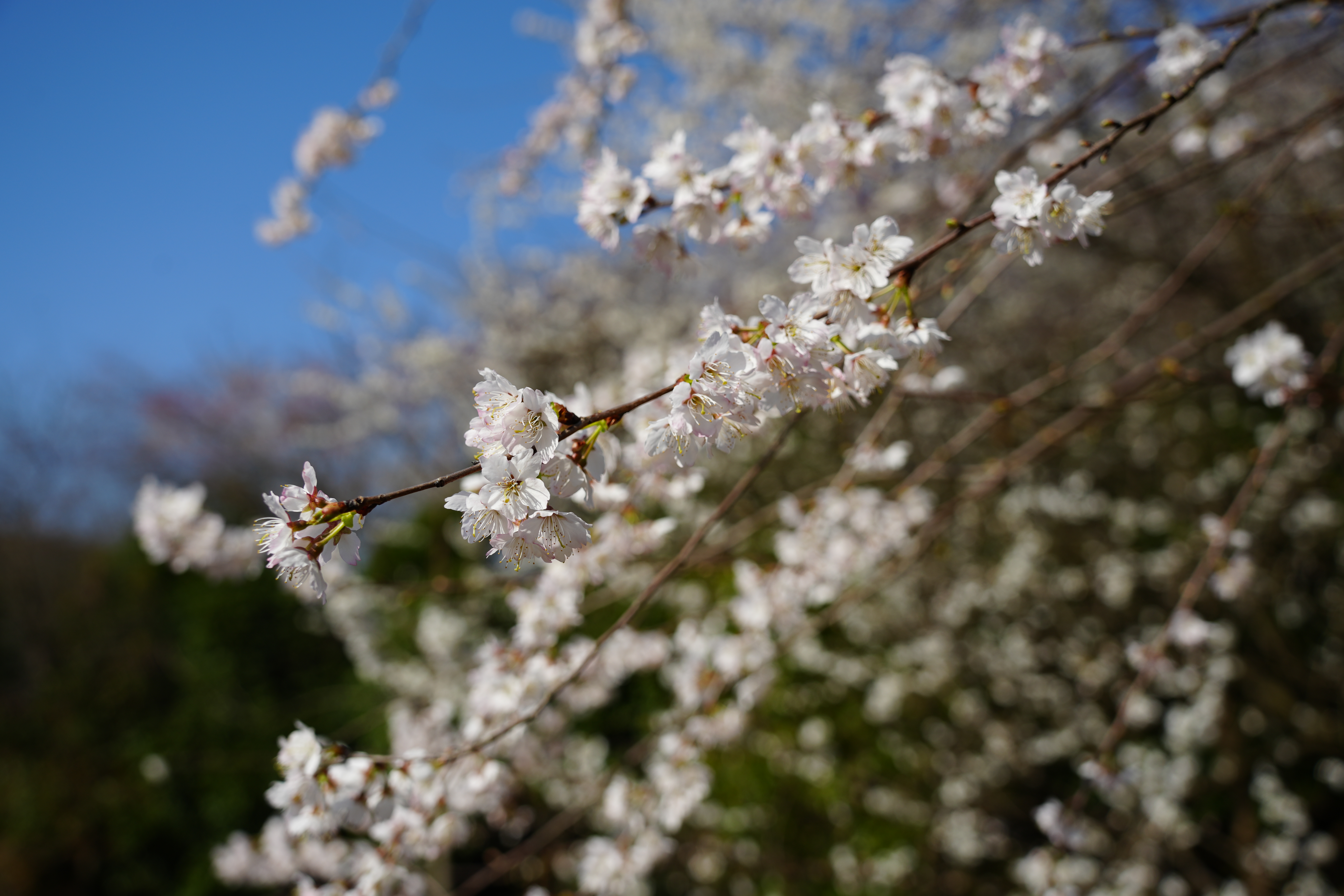 放眼山坡,一朵朵娇俏的野樱花遍布枝头,在早春的暖阳下,显得格外娇艳欲滴。远远望去一团团、一簇簇的樱花或雪白,或粉红,或淡黄,在花海中掩映重叠、争奇斗艳,十分壮观,让人忍不住陶醉花海之中,以春风为伴,与樱花共舞。