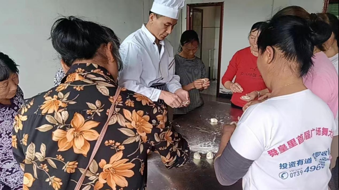 搞培训,暖民心。为增强党员干部联系群众、服务群众功能,蒋正兴充分利用在部队服役时学到的一技之长,带领工作队成立面点培训班,到目前已经举办六期,授课18个课时,教授面点制作十余个种类,培训人员60人次。从一开始的几人到现在的几十人,报名参与的村民越来越多,大家口口相传,互相帮助,交流心得,既学了技术,又融洽了邻里关系。部分村民表示学成以后开早餐店,也可以为家人提供丰富的饮食种类。村民们纷纷表示,这样的培训活动非常有意义,不仅提高了他们的自立自强意识和就业能力,还让他们感受到了乡村经济发展的新希望。