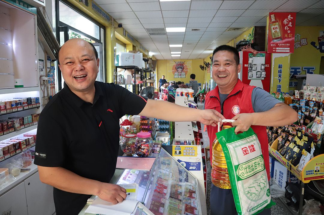 邵阳新闻网9月11日讯(记者 刘其洁)9月11日上午,在北塔区状元洲街道柘木社区的前程商贸超市内,志愿者刘志亮正用他八月份积累的志愿服务积分兑换大米、油等日常生活用品。
