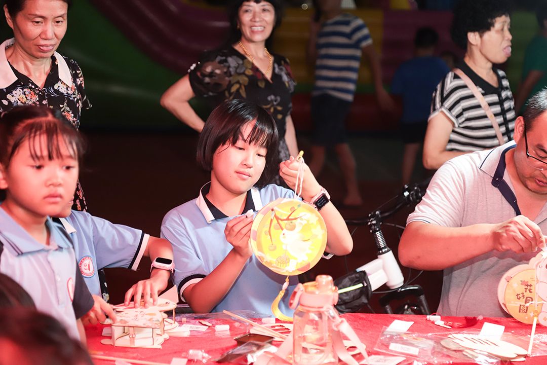 巧手DIY区则是孩子们展现创意的舞台,他们动手制作中秋夜光灯笼,一盏盏精美的灯笼点亮了社区的夜空,也照亮了孩子们的心灵。