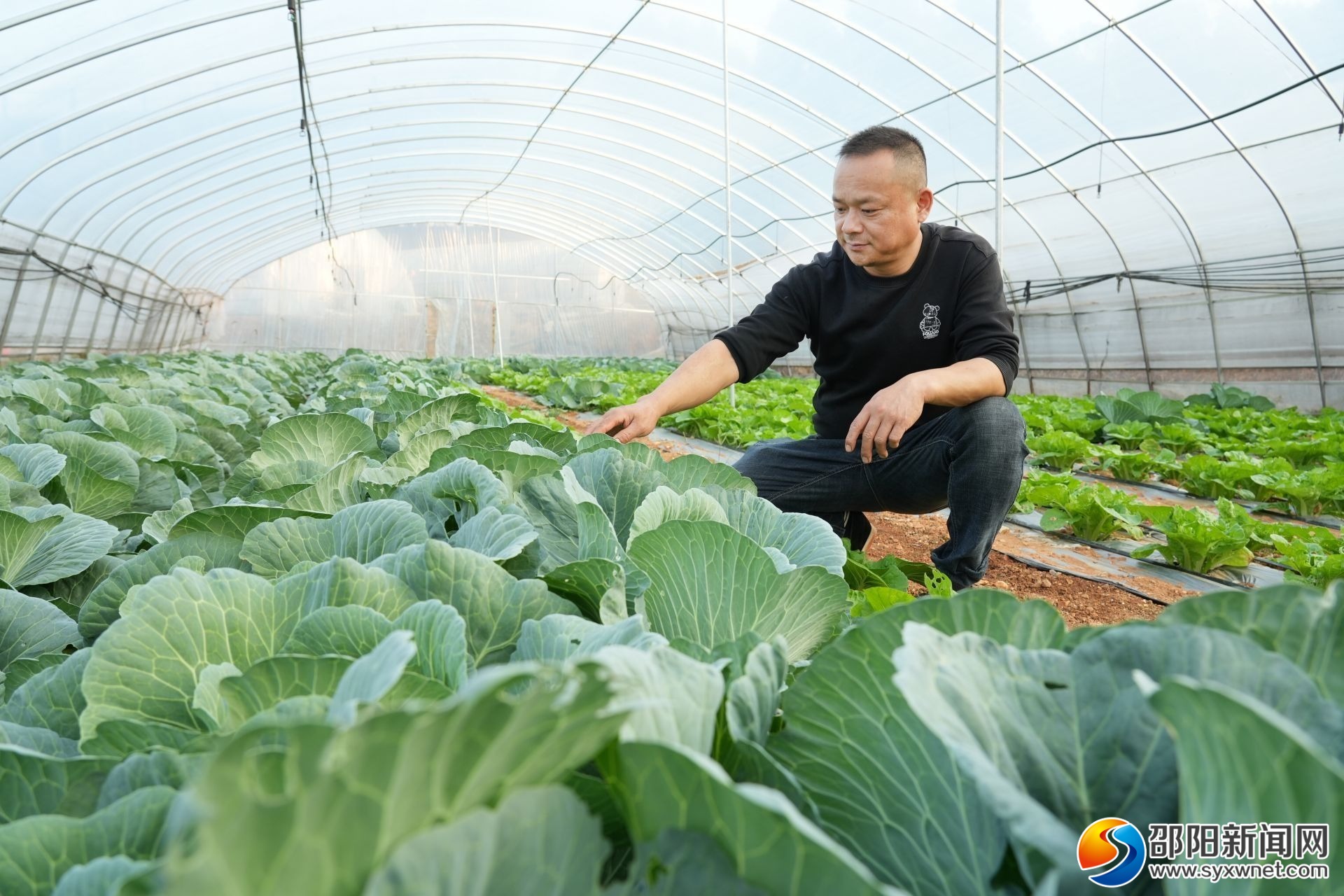 邓宏鹰在大棚内查看蔬菜