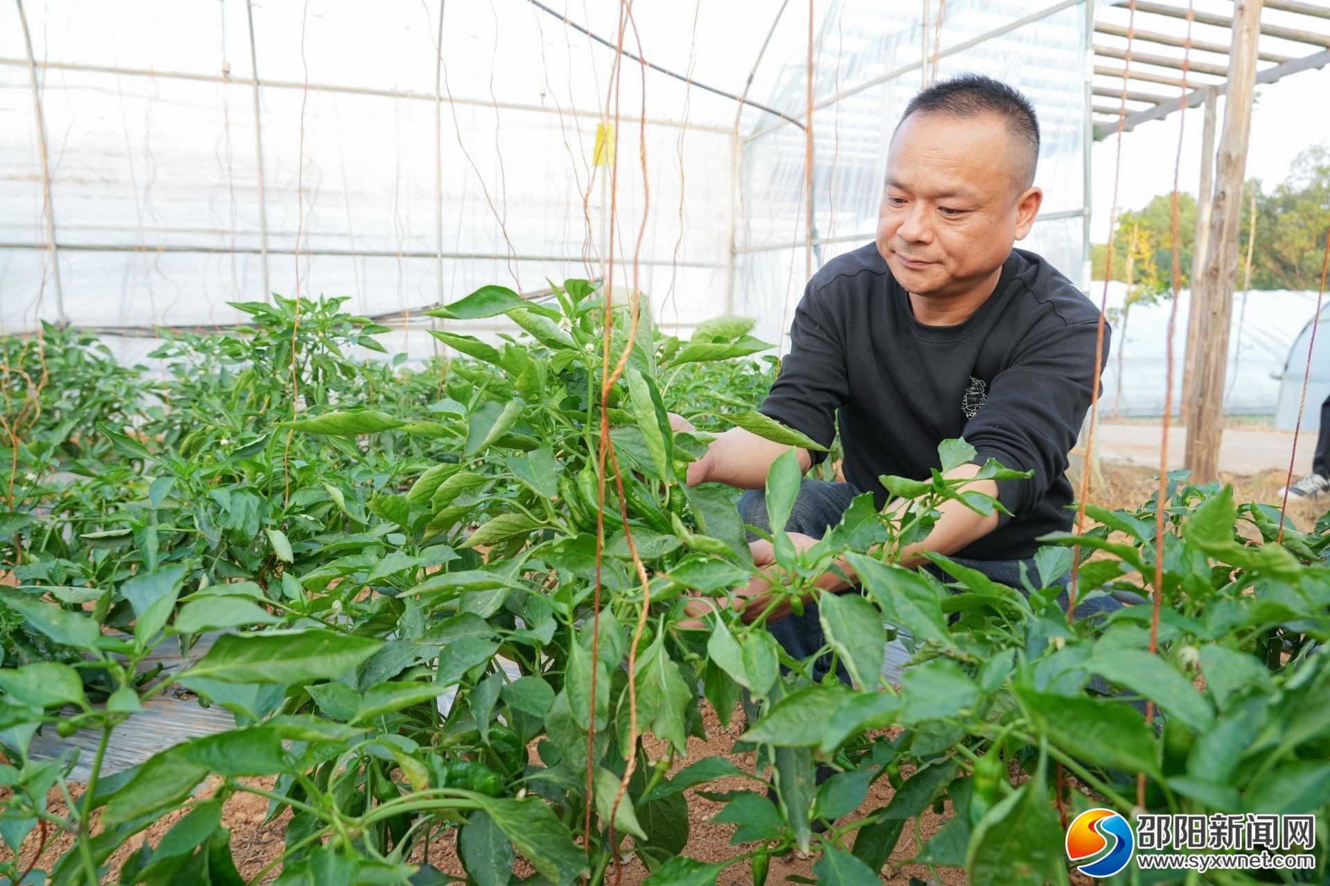 邓宏鹰在大棚内查看辣椒长势