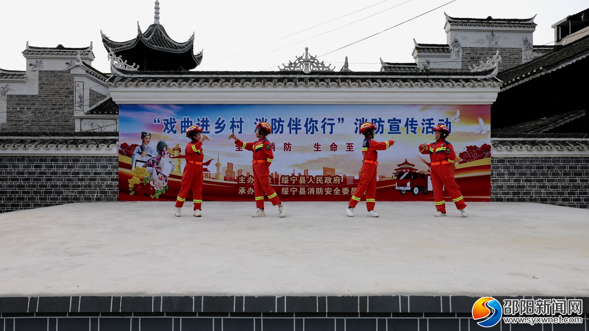 邵阳新闻网12月5日讯(通讯员 唐芳艳 尹杰)12月4日,在绥宁县寨市苗族侗族乡西河村戏台,4名身穿消防救援服的演员们表演黄梅戏《女驸马(消防版)》,引得台下村民兴致高昂,欢呼喝彩。这是绥宁县“送戏下乡”活动的一个缩影,现代舞蹈《我们都是消防人》、消防员之歌《人民有我》、黄梅戏《女驸马(消防版)》等精彩节目轮番登场,村民们看的津津有味。