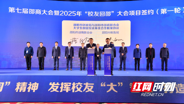 ▲第七届邵商大会暨2025年“校友回邵”大会项目签约现场。