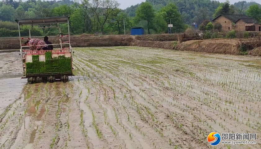 纵横交错的稻田里水光潋滟,波光荡漾,大地生机勃勃。只见插秧机来回穿梭在田间“大显身手”,不一会儿一株株嫩绿的秧苗从插秧机苗盘上滑落,稳稳地“站立”在水田里,原本光秃秃的水田很快披上了“绿装”,放眼望去,农民劳作的身影,与河流、民居、大山相互映衬,构成了一幅美丽的乡村田园画卷。