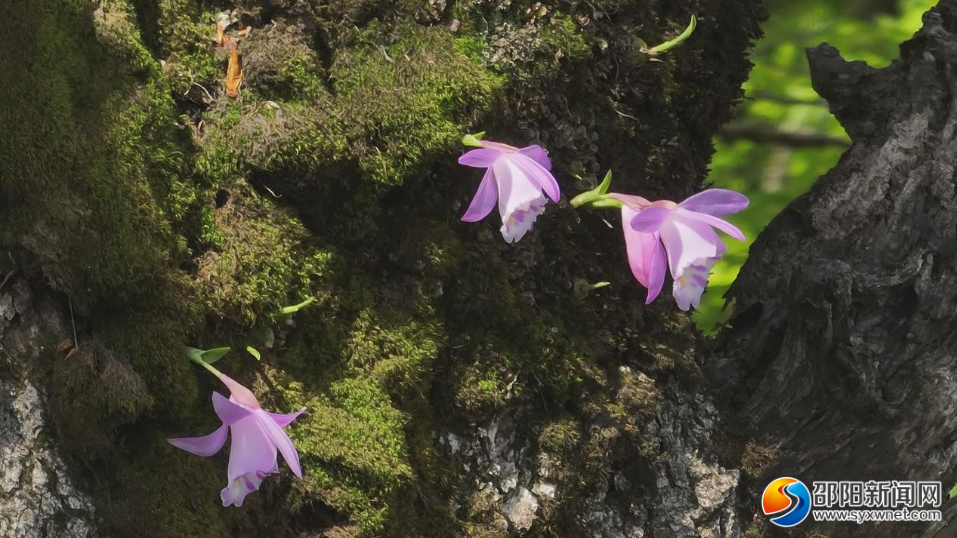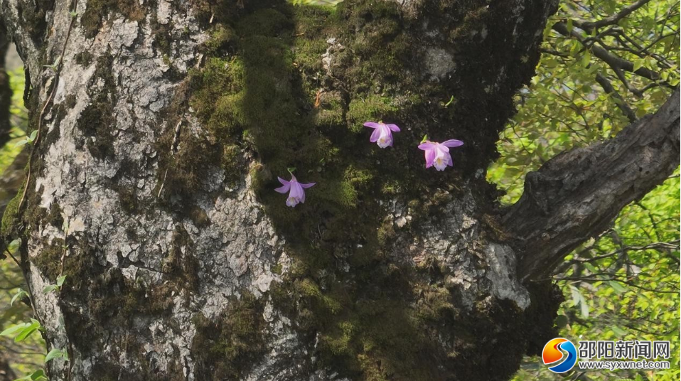 此次发现的独蒜兰生长在金童山片区古树的苔藓之上,3株独蒜兰正值花期,花朵呈紫粉色,形态优雅,迎风摇曳。还有几株独蒜兰尚处于幼苗状态,不见花苞,却蕴含着蓬勃的生机。工作人员通过现场观察植株形态特征,并结合相关资料进行比对鉴定,确认其为独蒜兰。
