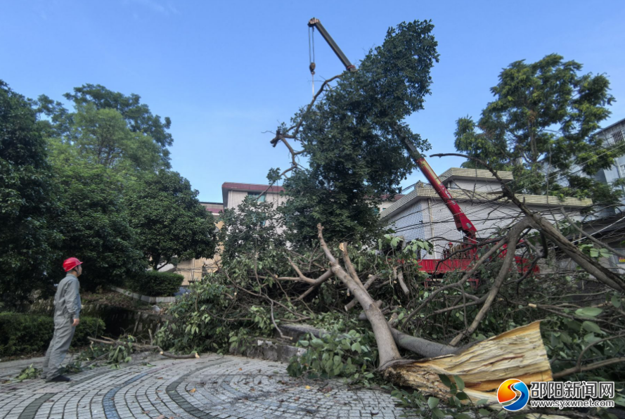 邵阳新闻网6月10日讯(通讯员 谢丽英)6月8日凌晨,一场突如其来的雷雨大风袭击了新邵县城。4点40分,狂风将靠近新邵县第一中学高考考点配电房门口的一棵大树上的几根分枝干吹断,眼看断裂的树枝就要压在旁边的低压主干线上了。