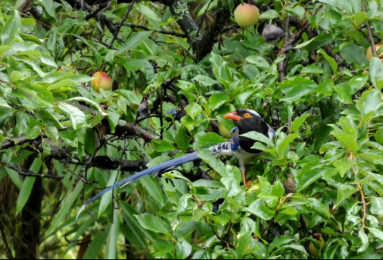 红嘴蓝鹊性喧闹,喜结小群活动。其对栖息地环境要求严苛,只有森林覆盖率高、虫害平衡的区域才能见到它们的身影,因此也被视为生态系统健康的“活指标”。在生态系统中,它们更是不可或缺的“守护者”:每天能捕食大量松毛虫、尺蠖等农林害虫,为森林健康撑起天然屏障;取食野果时,又会将种子带到远方,助力植被繁衍。