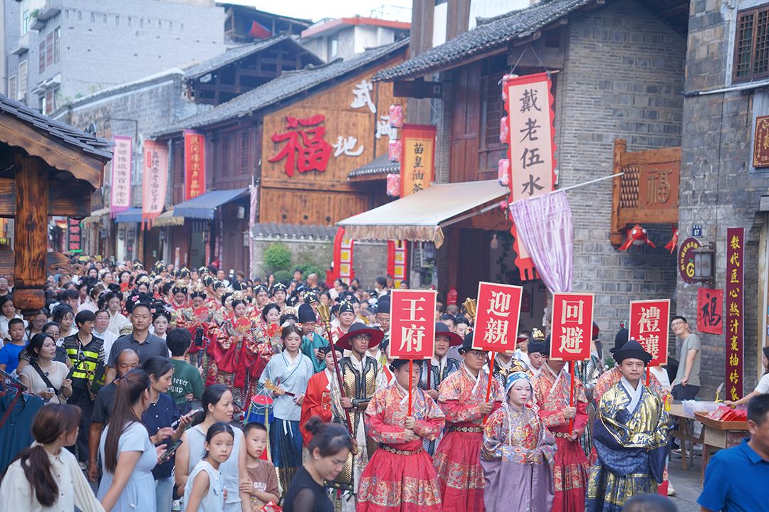 武冈与明制婚礼的渊源可追溯至明朝开国皇帝朱元璋第十八子朱楩封藩于此、建造岷王府的辉煌历史。那段历时232年的“王城”岁月,让精深的明文化在此深深扎根。婚礼现场,新人华服加身,新娘身着凤冠霞帔、大袖衫搭配流光溢彩的马面裙,新郎则头戴簪花乌纱帽、身穿象征吉庆的赤色圆领袍。他们遵循“纳采”“亲迎”等传统流程,生动再现了明代婚礼特有的“摄盛”风韵,充分展现了武冈厚重的文化底蕴。