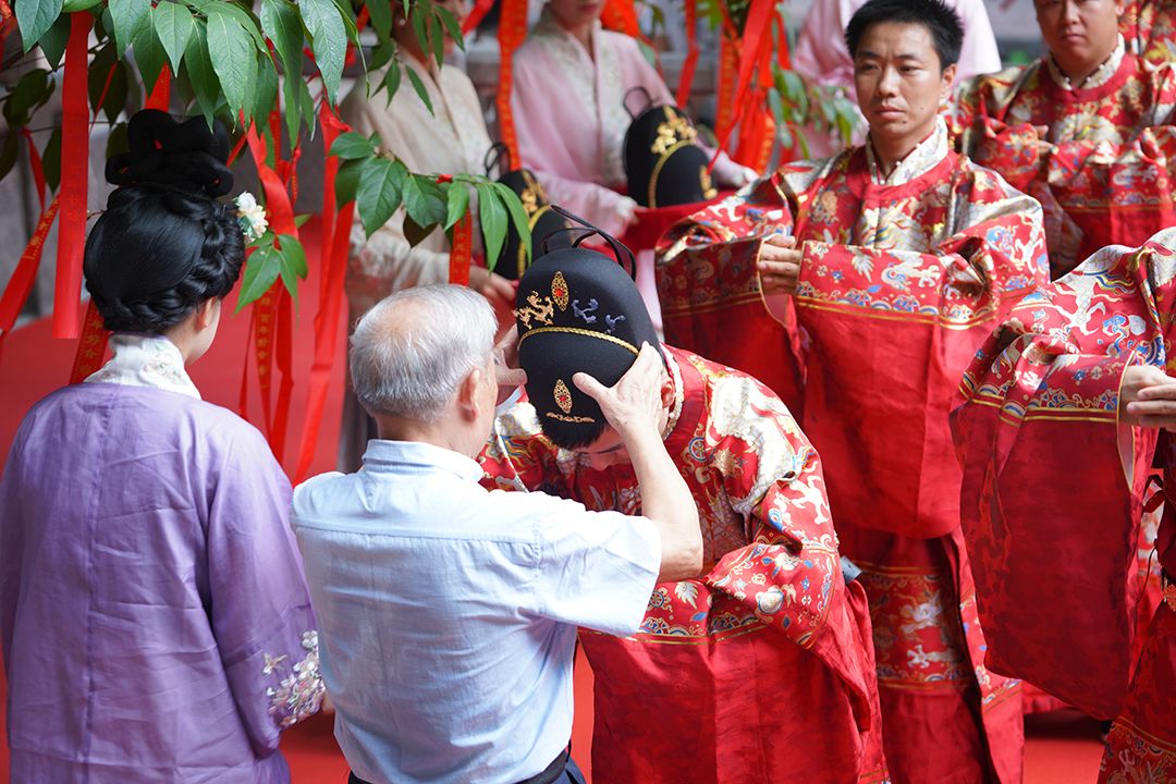在文庙,新郎们依次行加冠礼,宣告成年之责,以“孝悌忠信”自省,深刻呼应儒家礼制核心。 在王城公园,新娘们郑重行及笄礼,一加发笄,青丝轻绾,寓意褪去少女稚气,正式迈入人生新阶段。 加冠后的新郎们自文庙整装出发,带领盛大的迎亲队伍,吹吹打打,穿越烟火升腾的西直古街青石板路。新人步履轻快,簪花摇曳,红袍逶迤,完美复现了古礼中“亲迎”的核心环节。
