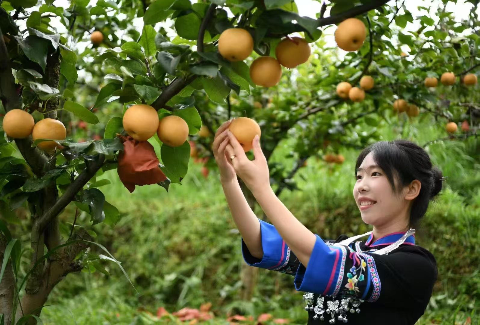 游客在秋月梨基地体验采摘秋月梨乐趣