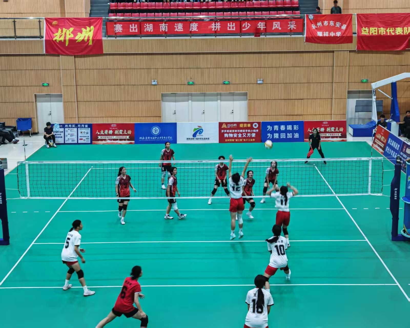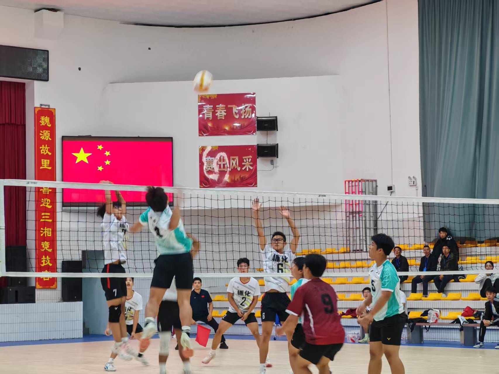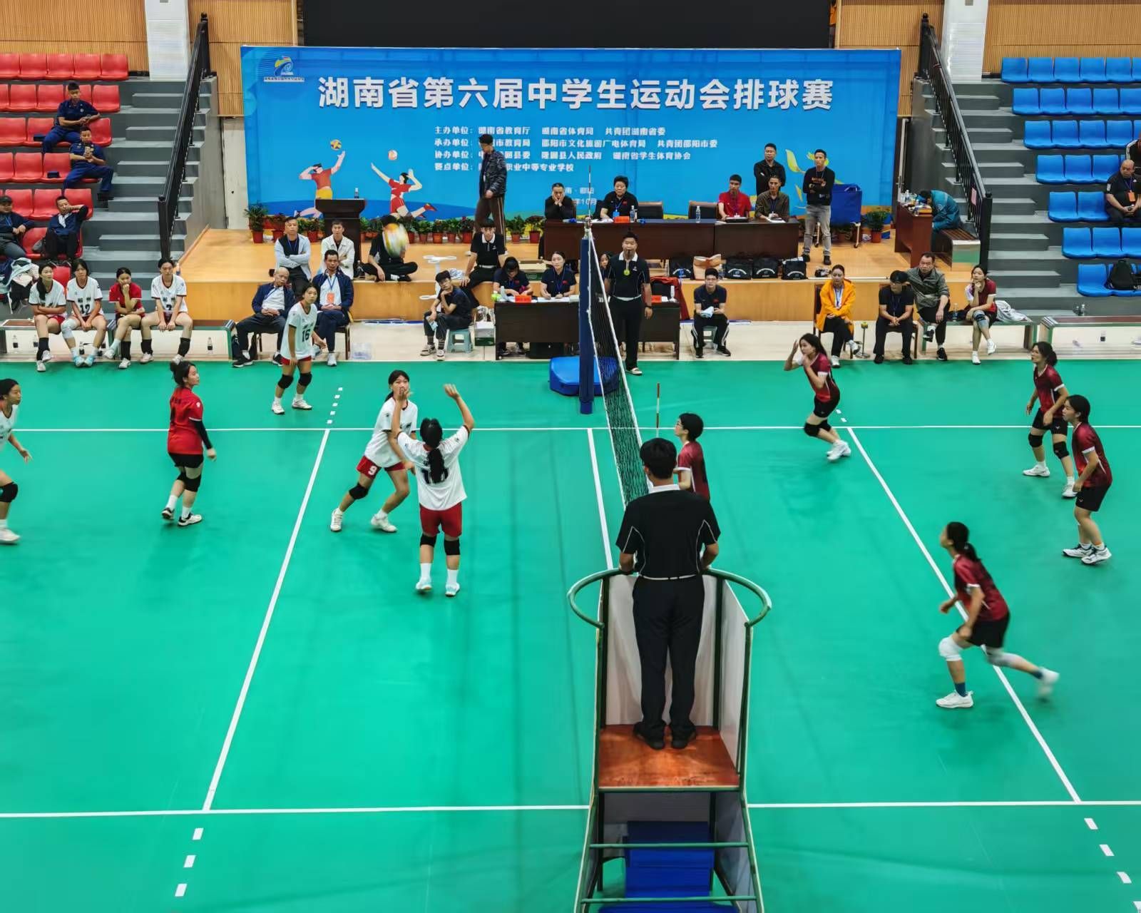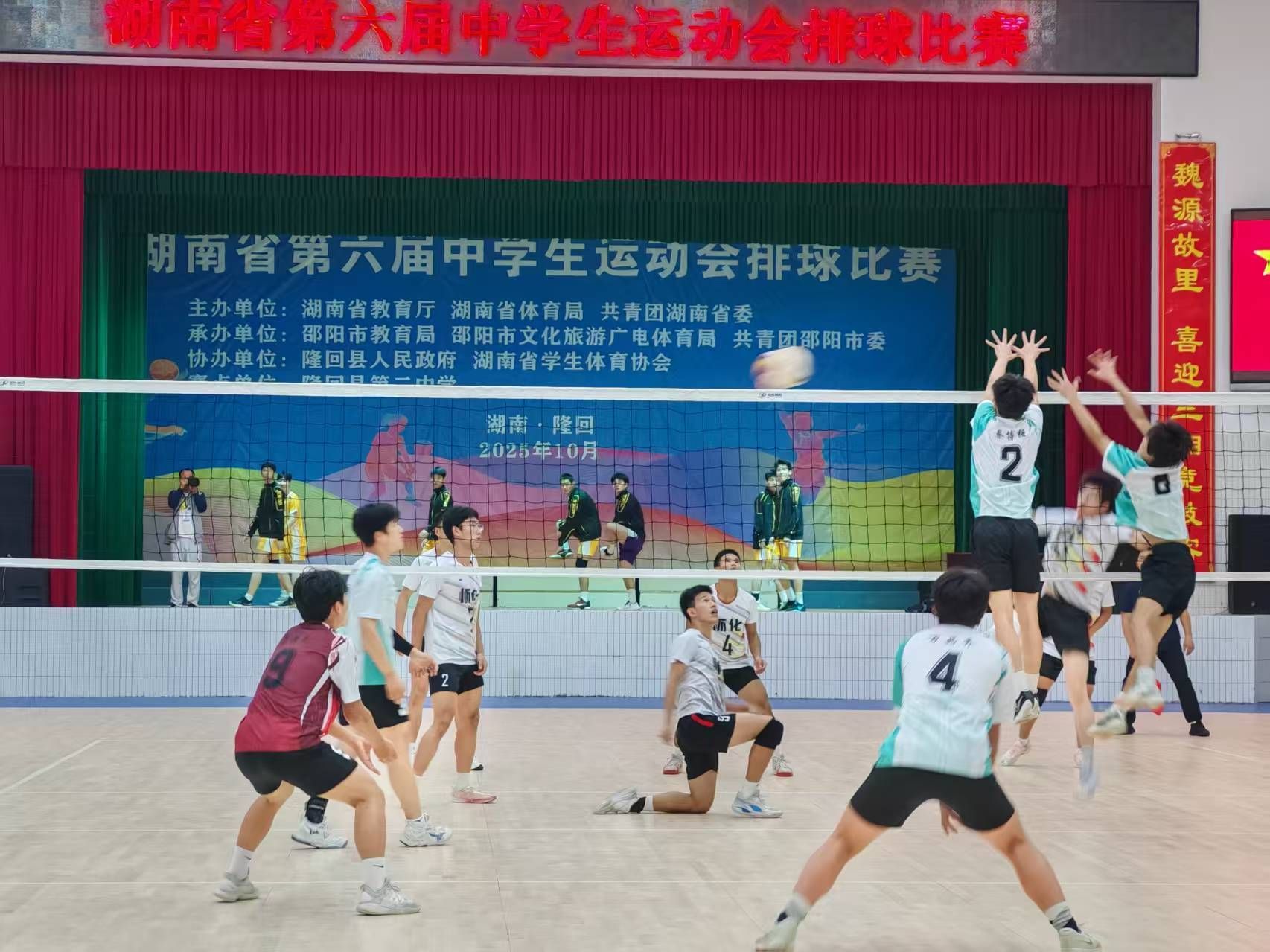 本届运动会排球赛事分设两个赛场。男子组比赛在隆回县第二中学体育馆率先打响。揭幕战由益阳市代表队对阵怀化市代表队。比赛伊始,双方迅速进入状态,发球、拦网、扣杀,场面紧张激烈。益阳市队凭借稳定的发挥和默契的配合,在首局比赛中便以犀利的进攻占据主动,队员们的每一次跃起扣杀都引得现场观众阵阵喝彩。怀化市队虽奋力拼搏,多次通过顽强的防守组织反击,但益阳市队始终控制着比赛节奏。经过三局鏖战,益阳市队最终以3比0的总比分战胜怀化市队,取得开门红。赛场上,运动员们挥洒汗水,每一次飞身救球、奋力拦网都展现了中学生运动员顽强拼搏的体育精神。