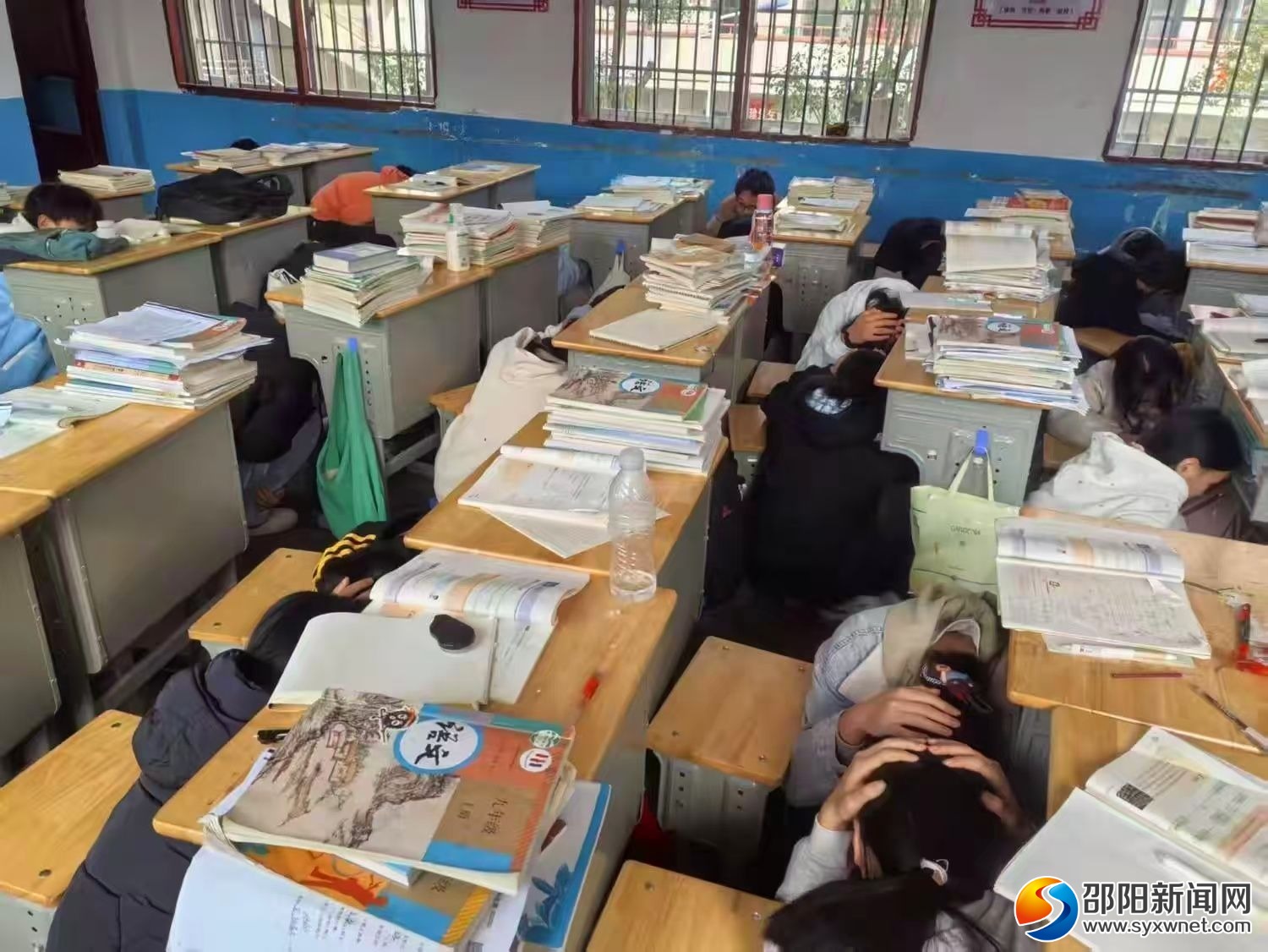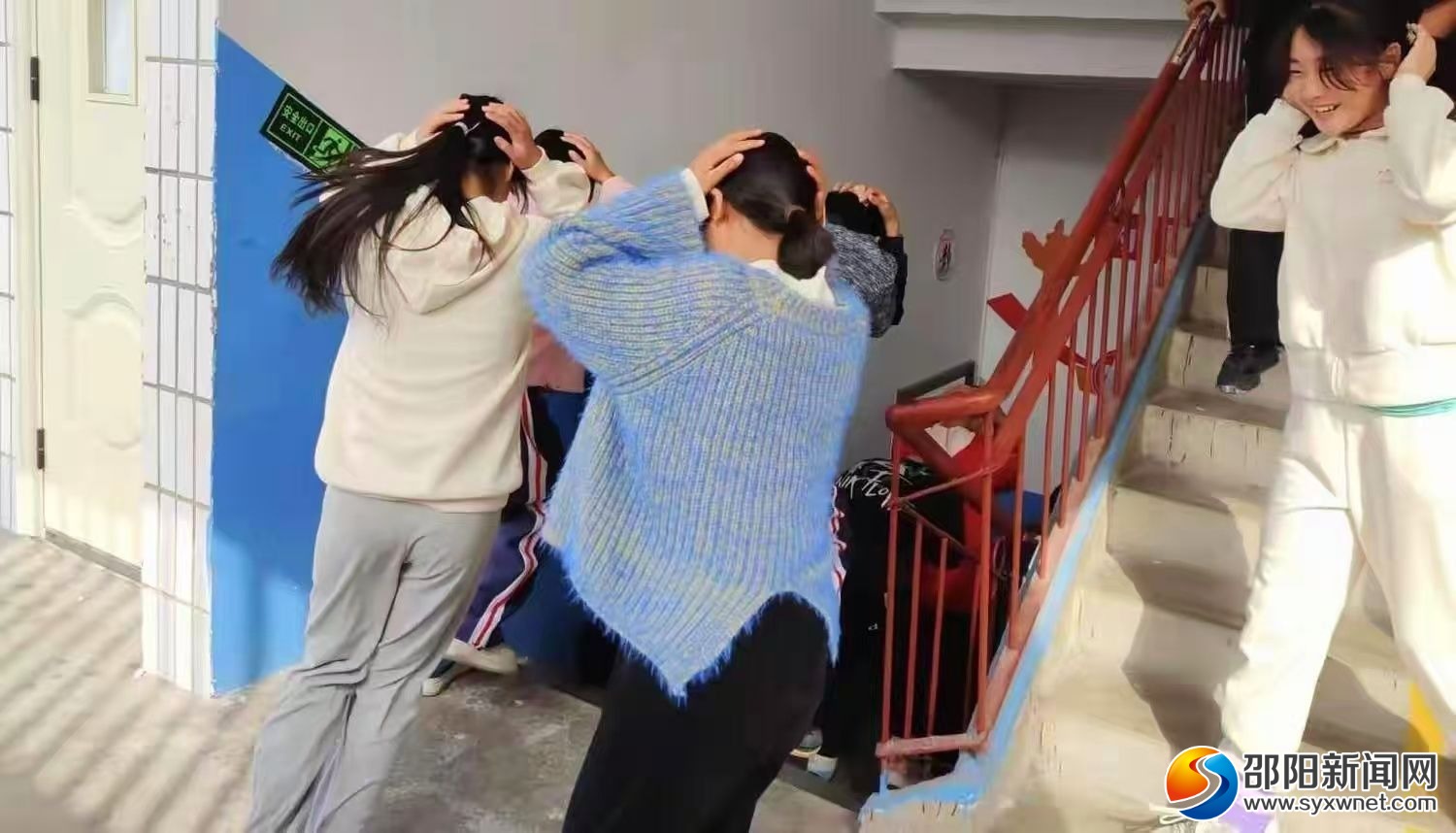 演练启动信号响起后,教室内学生迅速双手抱头、身体蜷缩躲在课桌下方,用手臂护住头部与胸部,构筑临时“安全屏障”。