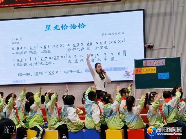 为备战此次市级展示,双清区华竹小学老师与双清区胡亚娟音乐名师工作室的教师们倾注了大量心血,共同组织了多次专题课程研讨活动。在长达大半个月的集中打磨中,团队精雕细琢,从课程结构的逻辑层次,到教师课堂上的每一句语言,再到课件画面的视觉呈现,均进行了反复推敲和优化。课堂中,老师巧妙地带来了尤克里里进行现场伴奏,轻快的琴声瞬间点燃了课堂气氛,深受二年级小朋友的欢迎。更令人耳目一新的是,她将AI技术无缝融入教学,通过模拟古代天文学家的生动讲解,为学生们揭开了“北斗星”的奥秘,化抽象为具体,真正实现了“让科技为教学服务” 的现代教学理念。此外,双清区华竹小学钟彦老师作为区域骨干,在此次活动中亦发挥了重要作用,她对高崇山学校熊文颖老师的《丰收锣鼓》一课进行了专业指导,展现了华竹小学在校际教研中的贡献与担当。
