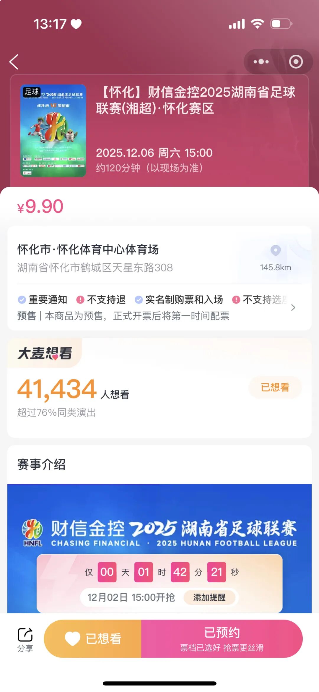 打开大麦网APP/小程序,搜索“湘超”选择怀化主场。