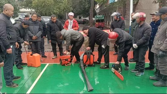部署会议结束后,全体参演人员迅速转移至乡政府篮球场,开展森林防火工具实操培训。在装备操作培训环节,林业站专业技术人员对风力灭火机、割草机、灭火拖把等常用扑火器材进行了系统讲解。培训重点包括各类器械的结构原理、启动方法、操作技巧、安全注意事项以及日常维护保养知识。讲解深入浅出,参训人员认真聆听。