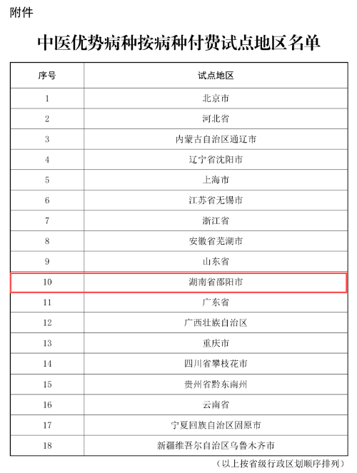 邵阳新闻网1月29日讯1月29日,国家医保局办公室、国家中医药局综合司联合发布了关于确定中医优势病种按病种付费试点地区的通知,18个省份及城市经严格遴选被确定纳入中医优势病种按病种付费试点范围,其中,邵阳市是湖南省唯一入选该试点的地区。