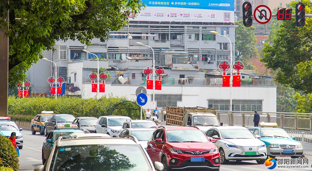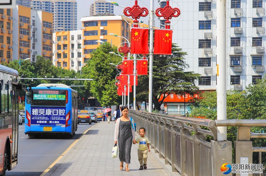 喜迎国庆的欢乐氛围已流淌在邵阳市区大街小巷。