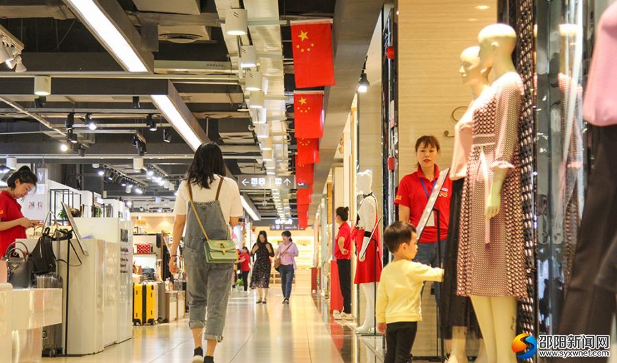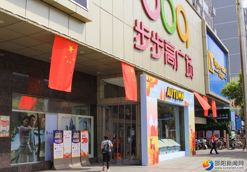 步步高商场悬挂五星红旗喜迎国庆。