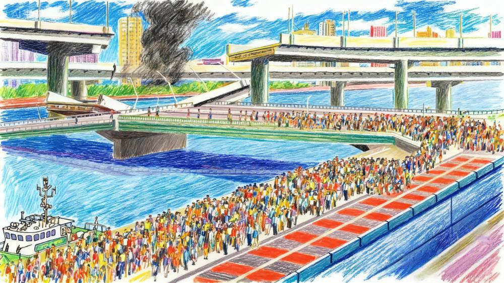 当震动暂歇,跨河大桥断裂的缆索仍微微震颤。悬在裂缝处的公交车摇晃着沉入黑浪。”