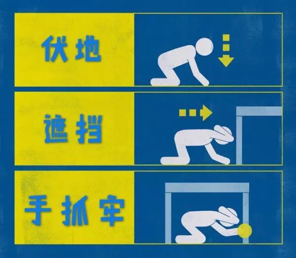 地震时要伏地,也就是迅速趴下,降低重心,这样就不容易摔倒了,保持机动的能力。遮挡,意思是用身边的东西保护头颈,比如软垫、书包、书本等一切可以利用的东西做缓冲。如果有可以遮蔽的家具,那就更好了,比如可以躲在书桌下。因为室内未固定的物品,如窗玻璃、吊灯、吊顶或未固定的家具,在晃动的过程中经常会将人砸伤。手抓牢,意思是要抓紧你用来遮挡的物体,防止晃动把你甩出去。