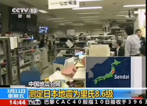 图片为日本311大地震新闻报道室内破坏情况新闻报道截图,可以看到画面东西受晃动影响,楼宇结构基本保持完成