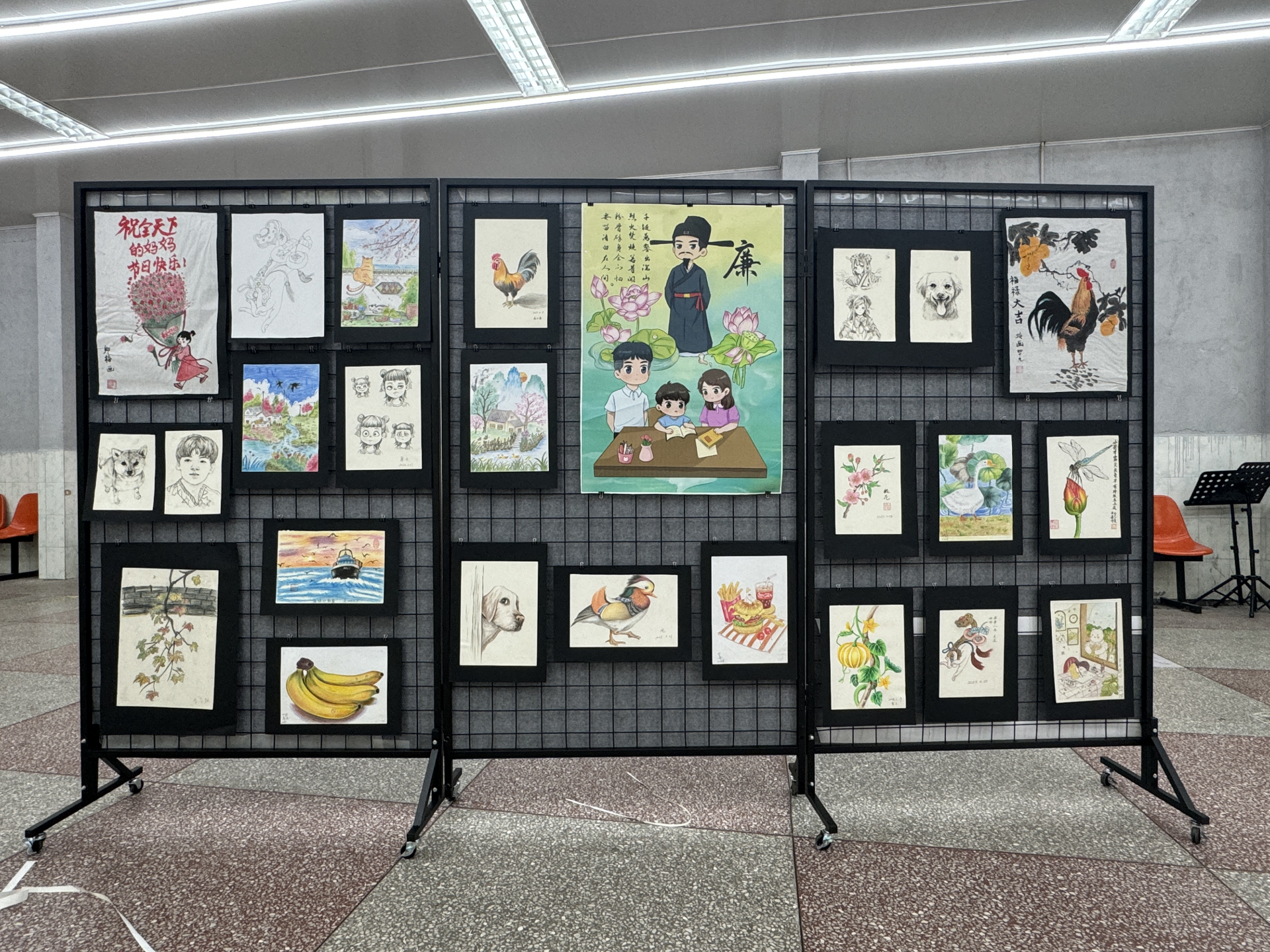 与舞台的热烈相得益彰,设置在舞台两侧的书画、摄影作品展览区吸引了众多观众驻足流连。这里展出的是文化馆免费艺术培训美术班、摄影班学员的倾心之作。一幅幅书画作品展现了学员们对美的追求和扎实的学习成果,一张张照片体现了“快乐的摄影人”如何用独特的视角,发现、记录并赞美着邵东的动人瞬间与时代变迁。