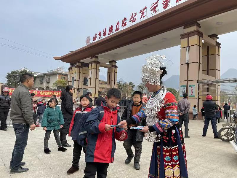 城步志愿者向学生发放法律法规知识宣传资料