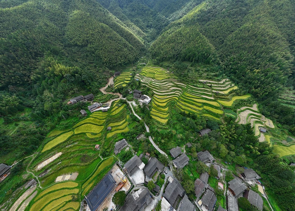 从高空俯瞰,高山梯田好似镶嵌在山林间的多彩织锦,满目金黄,美景一览无遗,层层梯田错落有致,随着山势的上升,展现出不同的颜色,宛如大自然的“调色板”。