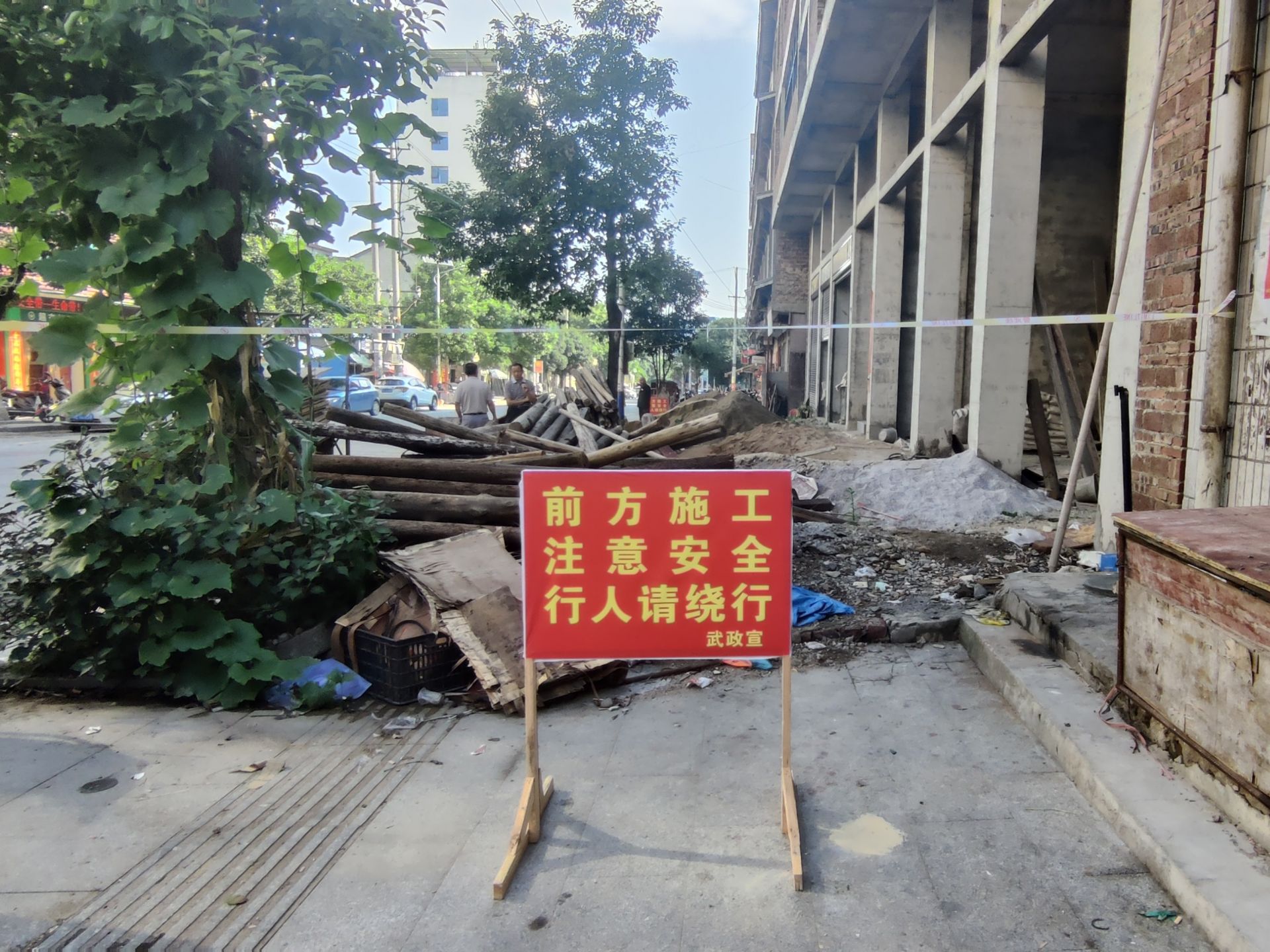 接到通知第一时间,武阳镇有关负责人带队前往施工地点,与施工现场负责人取得联系,当面了解具体情况,系因装修用泥沙、木料等未及时妥善处理,随意堆放在人行道上。带队负责人了解具体情况后,立刻设置安全警示牌两块、警戒线五条,并对有关负责人进行安全教育,详细告知施工占道安全隐患问题。同时,当面下发整改通知书,敦促有关负责人在期限之内整改到位。