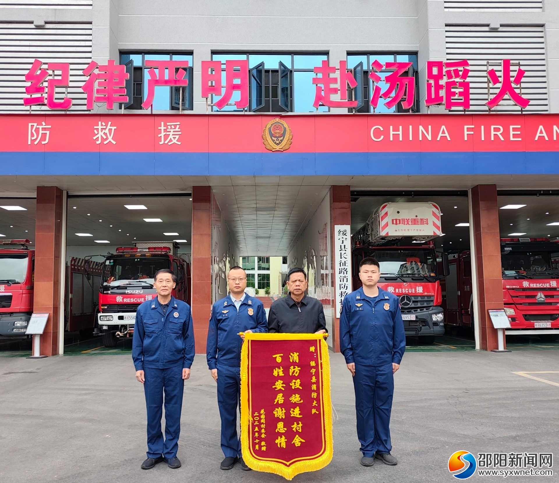 邵阳新闻网10月20日讯(通讯员 何静)10月20日,绥宁县关峡乡花园阁村党支部书记带着村民的嘱托,将一面写有 “消防设施进村舍,百姓安居谢恩情!”的锦旗送到绥宁县消防救援大队,以最质朴的方式,感谢大队为村里消防基础设施改造工程的倾力付出。
