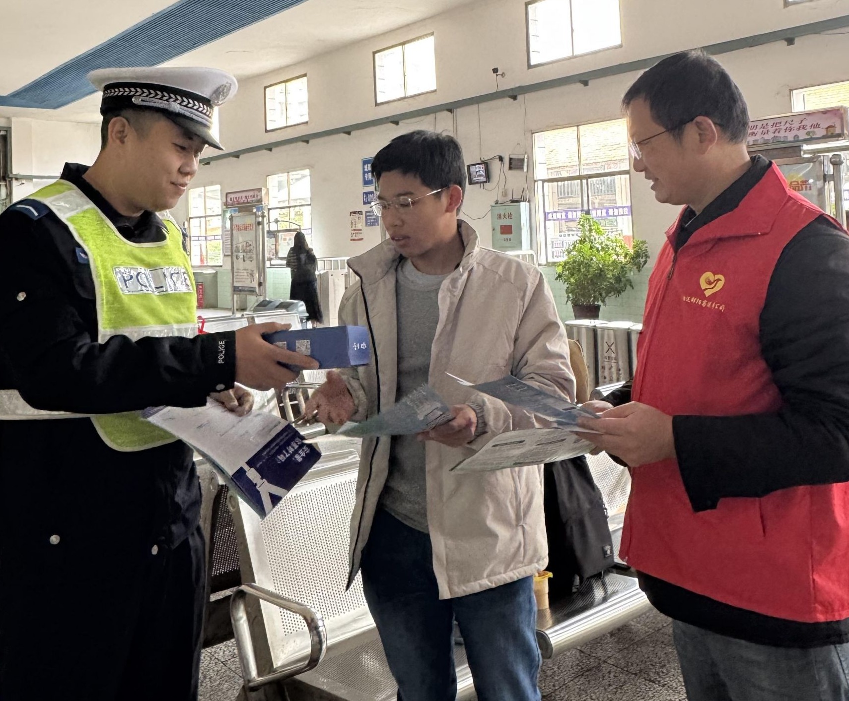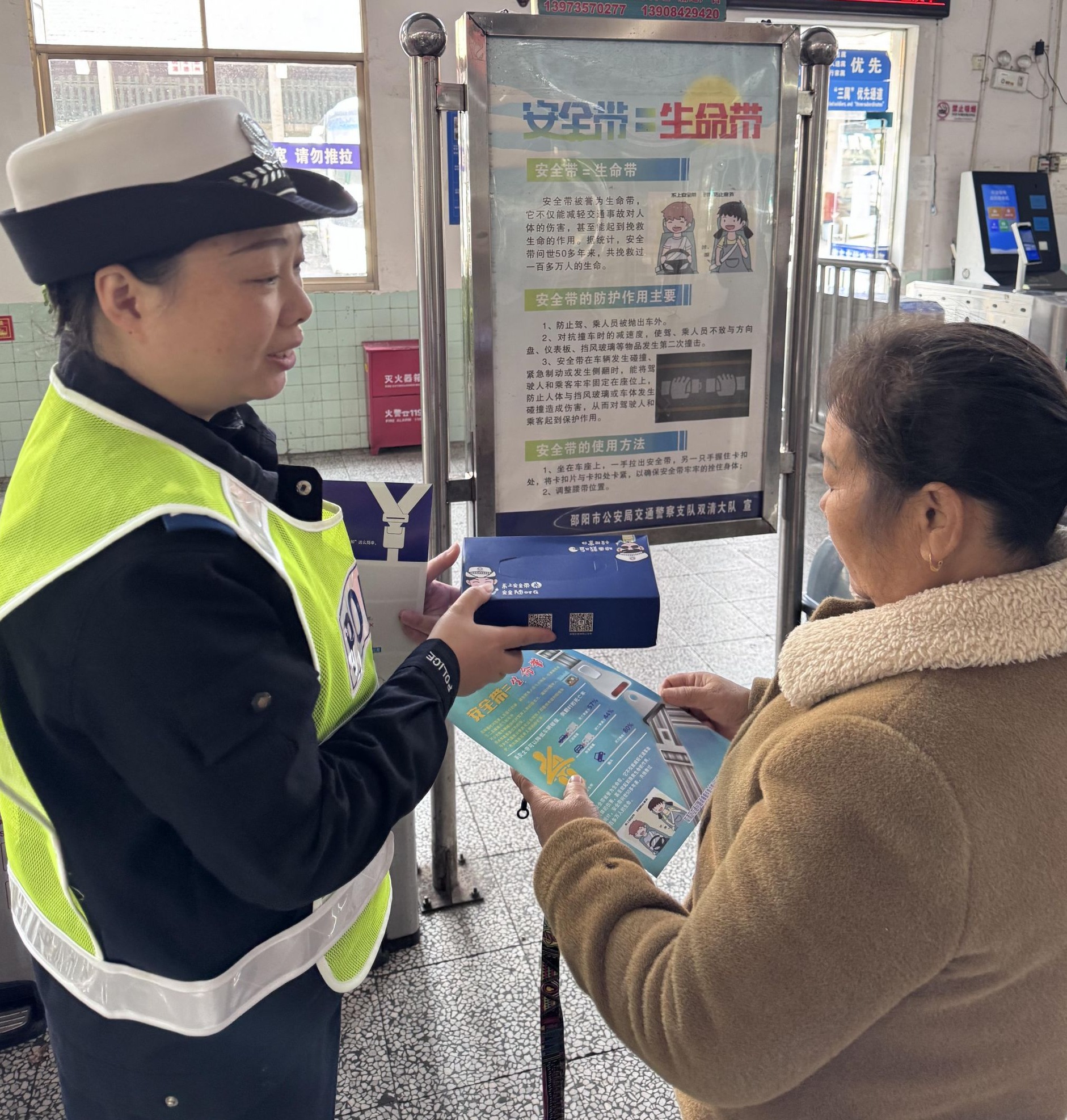 在车站候车室,宣传人员通过发放宣传资料、现场讲解等方式,向候车乘客讲解交通安全知识和日常乘车应注意的安全事项,提醒乘客乘车时,应主动全程规范系好安全带。同时现场赠送定制抽纸,引导大家树立“安全带就是生命带”“一盔一戴 安全常在”的安全意识,遵守交通法规,安全文明乘车。