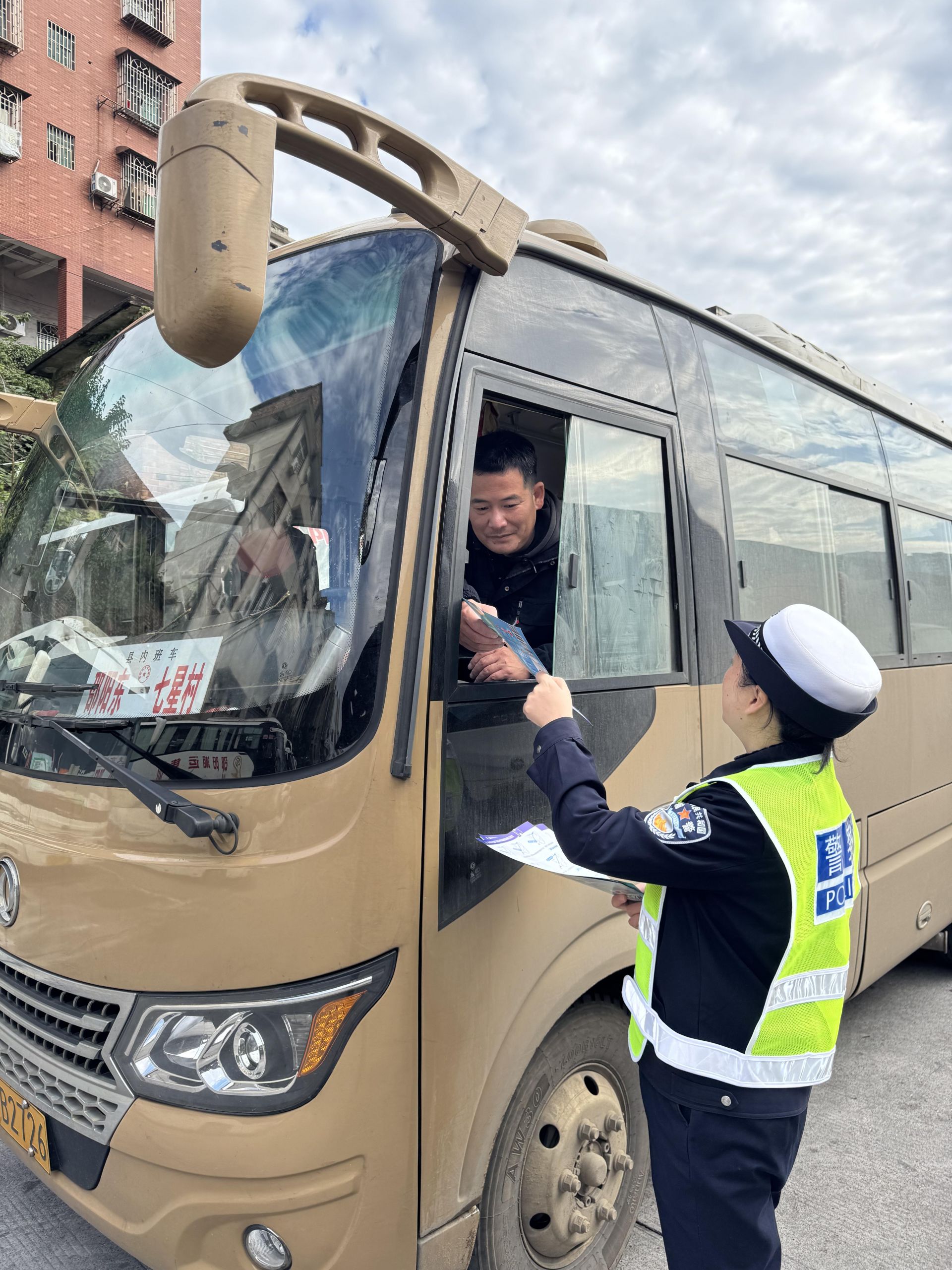 随后,双清交警登上待发客车,面对面向驾驶人阐述超员、超速行驶、违法超车、疲劳驾驶、酒后驾驶等严重交通违法行为的危害和后果。同时结合交通出行现状以及冬季天气环境等情况,提醒驾驶员应提前了解沿途路况,做到降速、控距、亮尾;遇拥堵缓行、交通事故等突发情况,要提前减速,避免急打方向和紧急制动,防止因车辆失控引发交通事故。