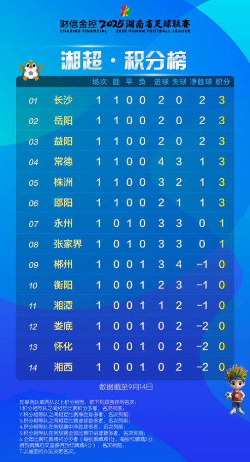 湘超积分榜、射手榜(截至9月14日)