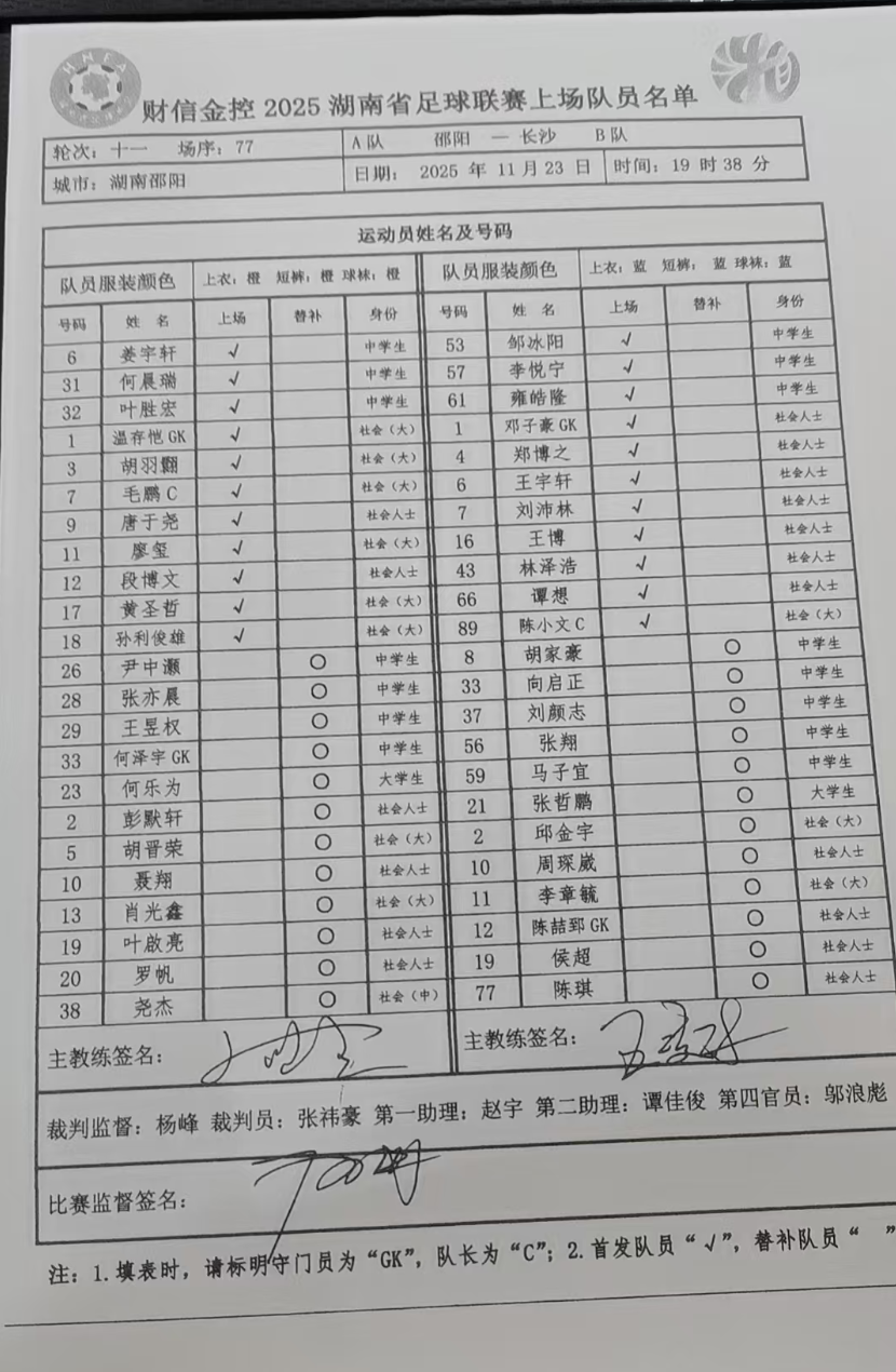 刚刚!邵阳vs长沙首发名单公布