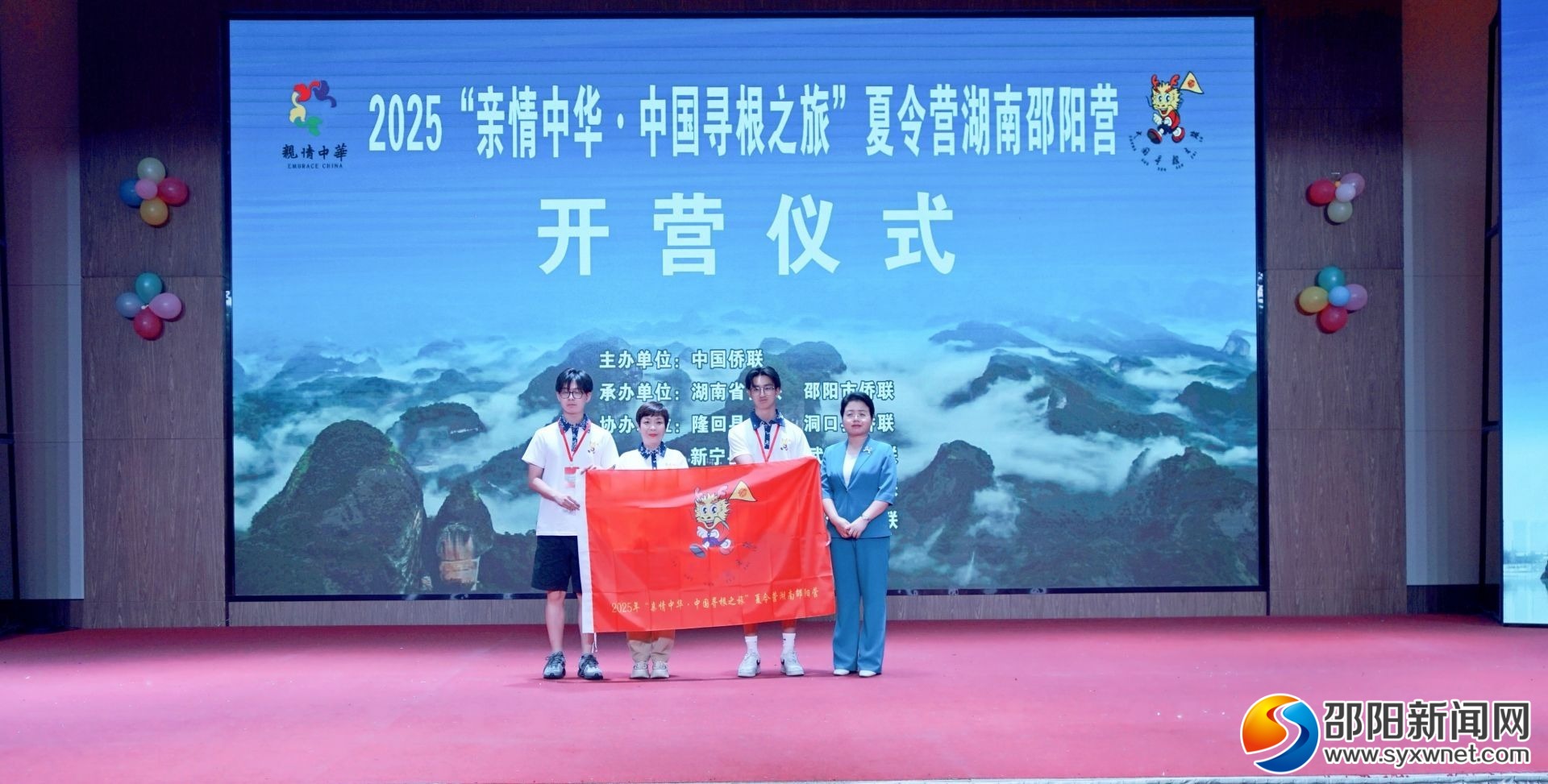 仪式上,营员代表、领队代表和志愿者代表作交流发言,黄重华和杨志慧共同为2025“亲情中华·中国寻根之旅”夏令营湖南邵阳营颁授营旗。