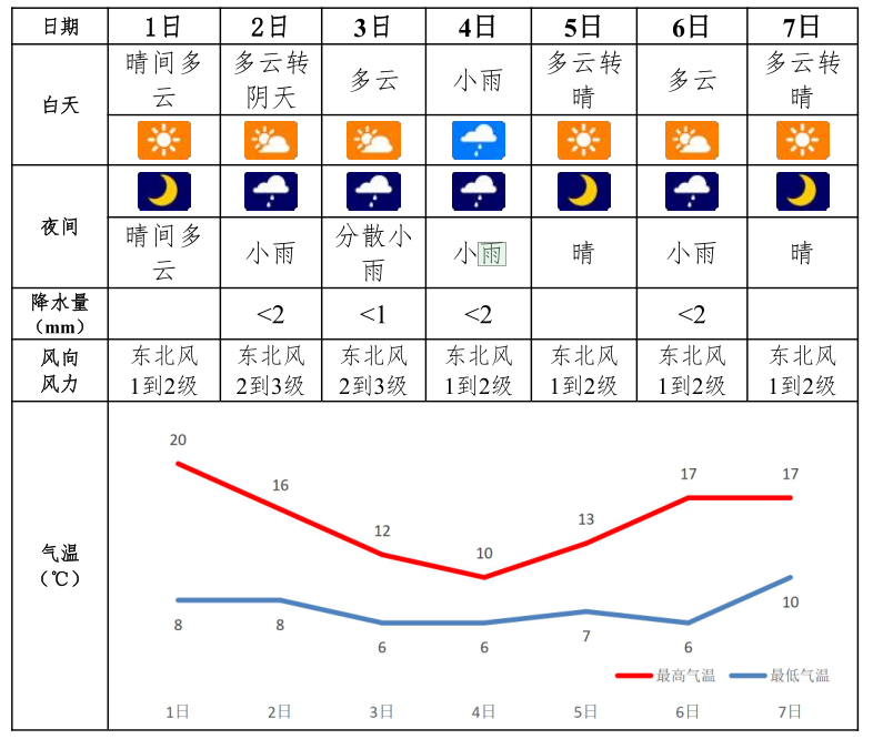 12月7日:多云转晴,东北风1到2级,气温10~17℃。