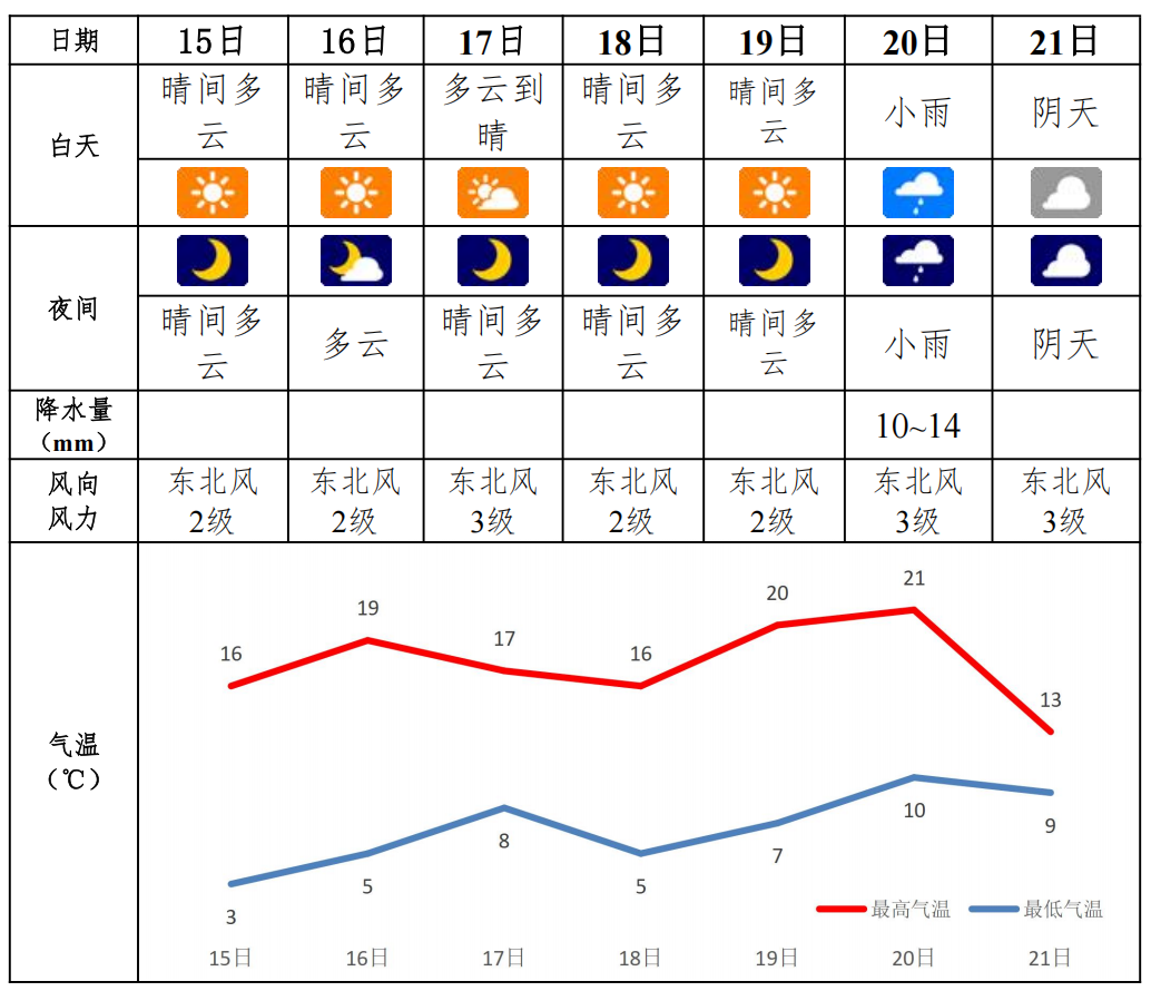 15日:晴间多云,东北风2级,气温3~16℃;