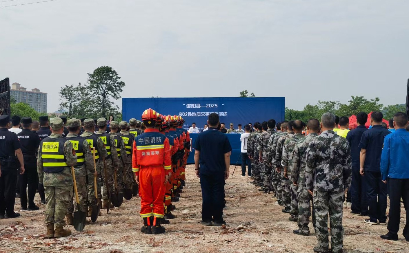 此次演练模拟邵阳县塘渡口镇连降暴雨,村级巡查员在巡查过程中发现梅子院原造纸厂旧址旁有突发性地质灾害险情,现场山体滑坡导致有人员受伤、有人员被掩埋,滑坡体后缘裂缝有进一步加大趋势,巡查员立即上报险情。接到险情报告后,当地政府部门立即启动三级地质灾害应急响应,并按照地质灾害应急方案,组织民兵、消防、公安、卫健、电力、通信、交通、自然资源、应急等各抢险救援队快速奔赴事发地点展开应急救援工作。