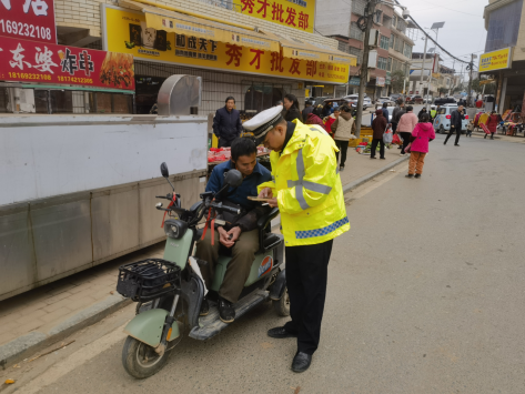 民警正在对未戴头盔的电动车驾驶员进行劝导