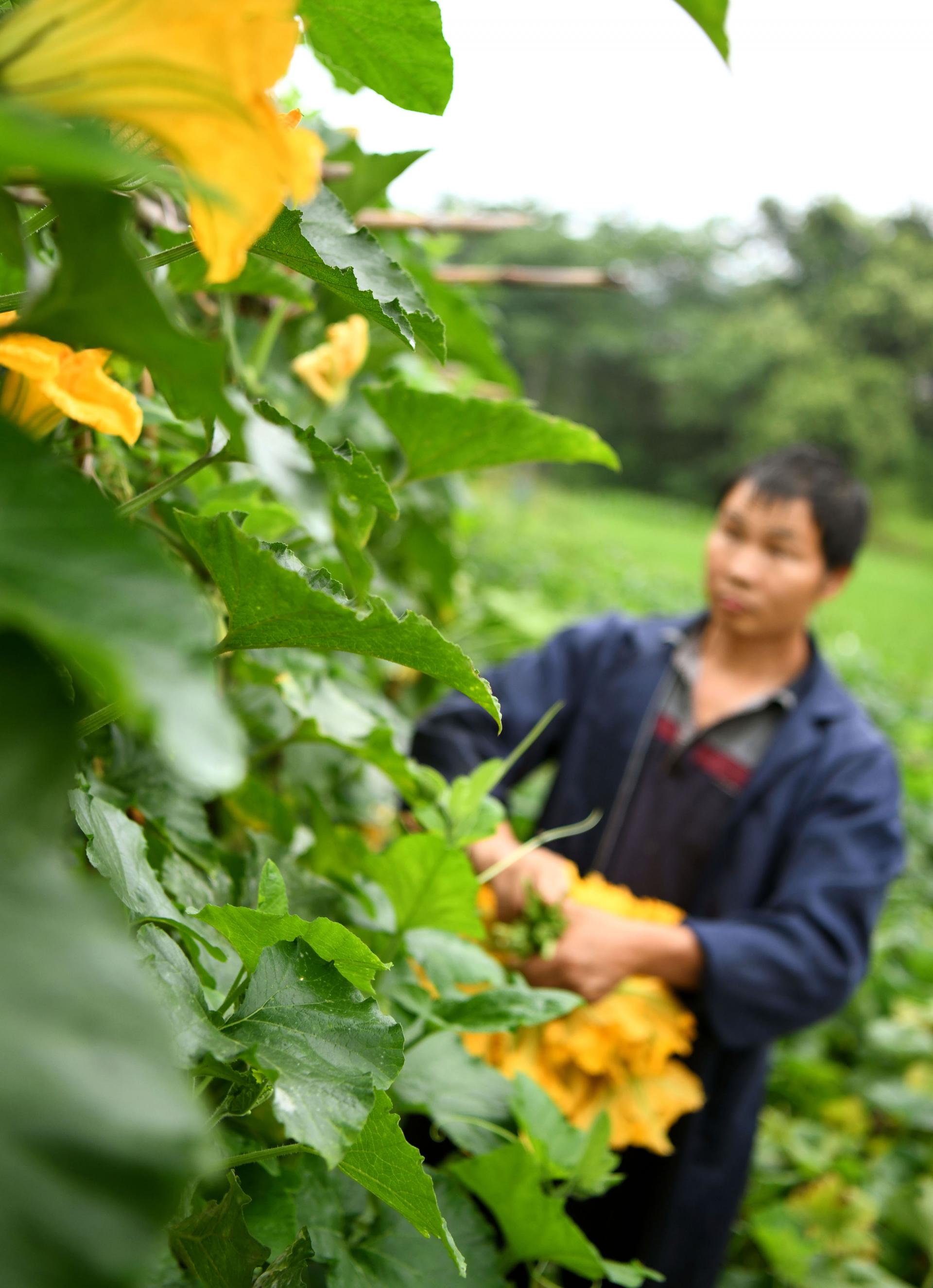 6月4日,城步苗族自治县儒林镇白蓼洲村农民在菜地里采摘西葫芦花。