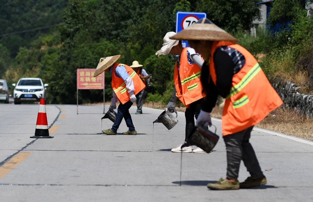 8月12日,城步苗族自治县国道G356线K1501+500M处,养路工人对路面进行清灌缝作业。