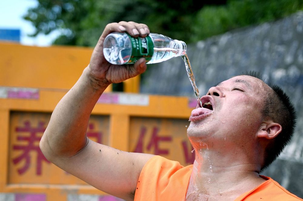 8月12日,城步苗族自治县国道G356线K1481+106M处,作业的养路工人利用空隙补充水分。