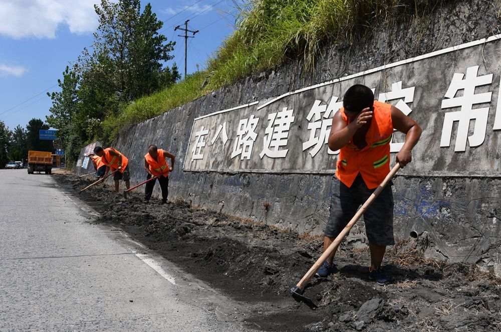 8月12日,城步苗族自治县国道G356线K1481+106M处,养路工人在清除路肩反坡杂草。